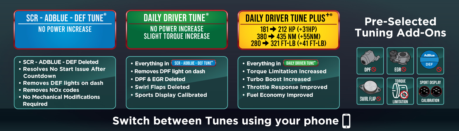 The Daily Driver Tune Plus+ is where performance meets reliability and efficiency. We have created this tune to improve fuel economy while also giving you a very significant increase in power. This tune will transform your car into a high performance machine for your daily commute.